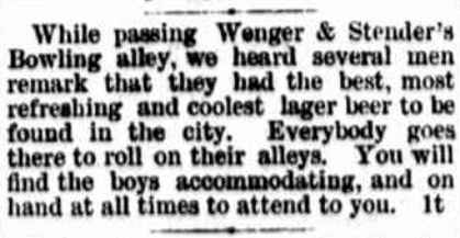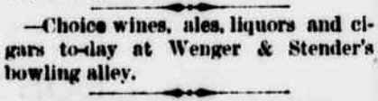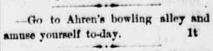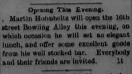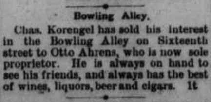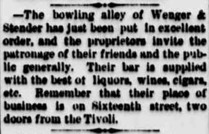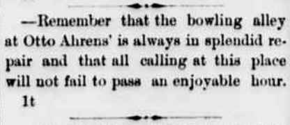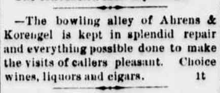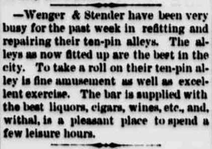 Huffsmith (Hufschmidt) Bowling Alley (187? - Nov 1875) Wenger and Stender Bowling Alley (Nov 1875 - Aug 19, 1878) Wenger Bowling Alley (Aug 19, 1878 - May 7, 1879) Kapp Bowling Alley (May 7, 1879 - Oct 1879) Ahrens and Korengle (Korengel) Bowling Alley (Oct 1879 - June 1880) Ahrens Bowling Alley (June 1880 - May 1881) Henson Bowling Alley (May 1881 - May 1882) Hohnholz Bowling Alley (187? - 1882) |