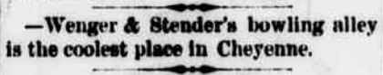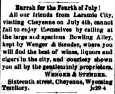 The saloon on the 1883 Sanborn map at 357 16th Street is the same address as 305 W Lincoln Way today (See 1886 map). Located two doors down from the Tivoli Saloon at the corner of Ferguson (Carey) and 16th. I'm not clear on whether August Huffsmith built the saloon and bowling alley or whether it was sold to him by a previous owner. August Huffsmith sells the saloon and bowling alley to Rudolph Wenger in November 1875. Rudolph Wenger and John Stender own the saloon and bowling alley by late 1875. Wenger takes over ownership when Stender dissolves his partnership in Aug 1878. Chris. Kapp takes ownership over R. Wenger on May 7, 1879 and subsequently sells the establishment to (Otto) Ahrens and (Chas.) Korengel by Oct 1879. Chas. Korengel sold his interest in the bowling alley to Otto Ahrens in June 1880. Otto Ahrens sold his saloon and bowling alley to Claus Henson in May 1881. In May 1882, there is a mention of Martin Hohnholz (Hohnholtz) opening the bowling alley but nothing thereafter. Between 1883 and 1886 the address system in Cheyenne was changed to reflect the current addressing of today. |