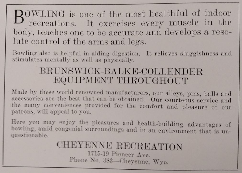 L C Mentz was the manager and/or owner of the lanes per the 1927-28, 1929 and 1930 Ives Wyoming State Business Directory. L C Mentz was the manager and/or owner of the lanes per the 1928 Polk Cheyenne City Business Directory. L C Mentz also was the manager and/or owner of a bowling alley in Torrington per the 1930 Ives Wyoming State Business Directory. Hal Humston was the manager and/or owner of the lanes per the 1931 & 1932 Ives Wyoming State Business Directories. Hal H Humston was the manager and/or owner of the lanes per the 1931-32 Polk Cheyenne City Business Directory. |