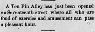 William Rosenbaun (or Rosenbaum) opened up in July 1874 and subsequently sold to Ern. Hufschmidt several months later. Will assume this establishment only had one bowling alley, typically of arcade variety, but need to confirm. In November 1875, Fred. Wenger took over the license of A. Huffsmith and his 17th street bowling alley. |