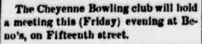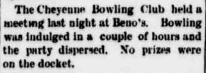 The saloon on the 1883 Sanborn map at 370 15th Street is the same address as 214 W 15th Street today (See 1886 map). By December 1876, Beno's Brewery and Bowling Alley was doing a fine business. Reference to George Beno and George Bescherer (Beschner) as managers and or owners in later years. This location also had pool tables, a shooting gallery and orchestrion. This bowling alley organized Wyoming's first bowling club (I believe) in March 1878. |