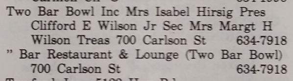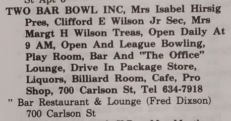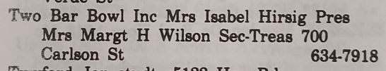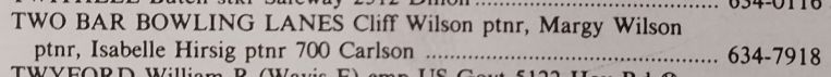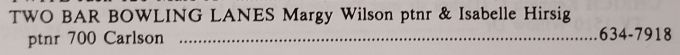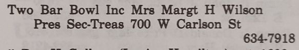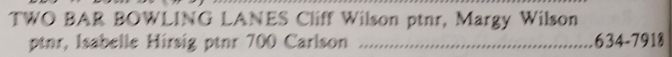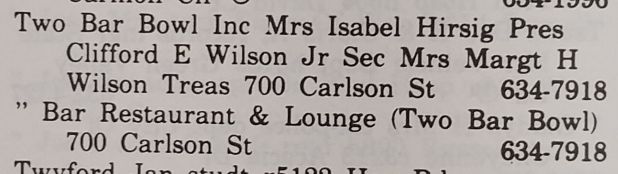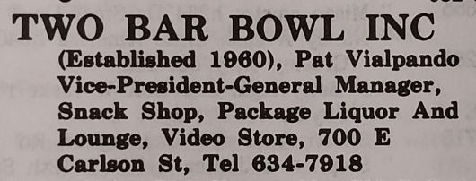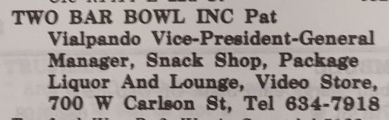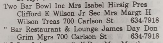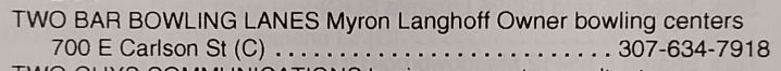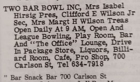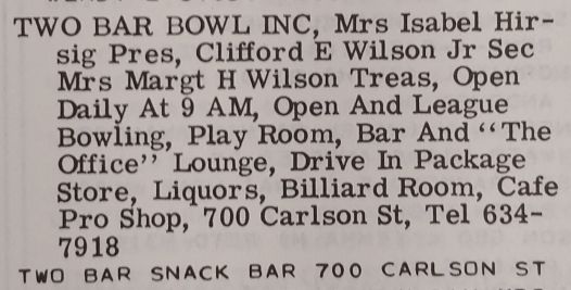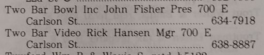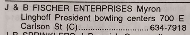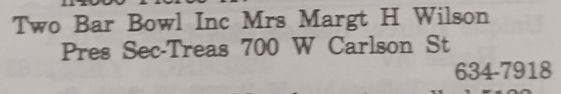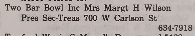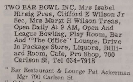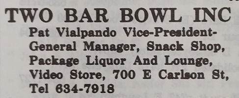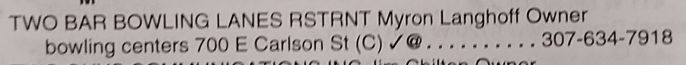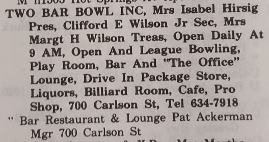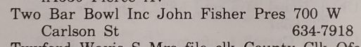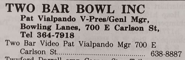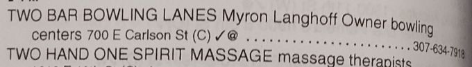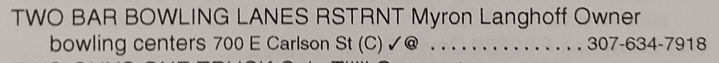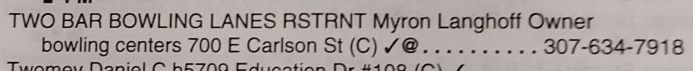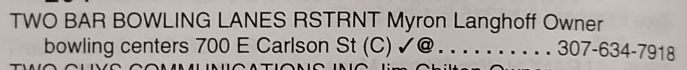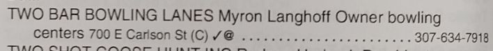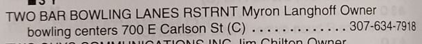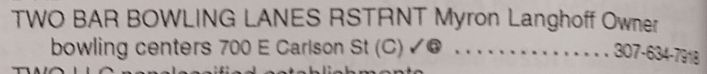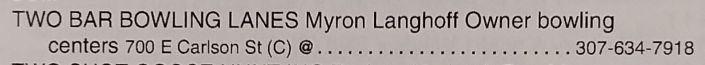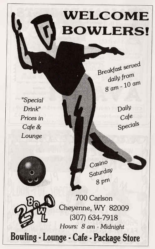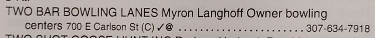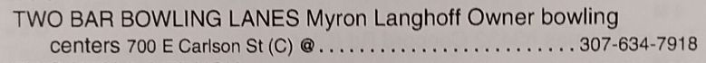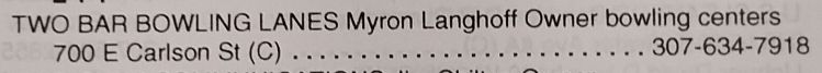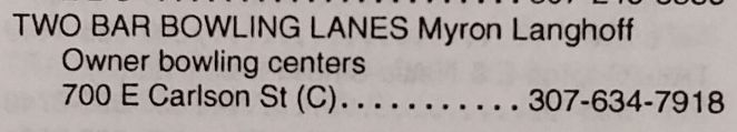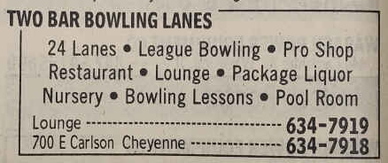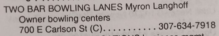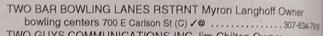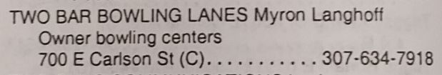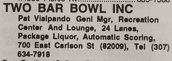 T Miyamoto was the general manager per the 1961 Polk Cheyenne City Business Directory. The Miyamoto brothers left to start Spot Bowl in 1961. Fred G Hirsig was president and Butch Wilson was the manager per the 1962 Polk Cheyenne City Business Directory. Isabel Hirsig was the president per the 1965 through 1980 Polk Cheyenne City Business Directory. Margaret H Wilson was the president per the 1981 through 1985 Polk Cheyenne City Business Directory. John Fisher was the president per the 1986 through 1997 Polk Cheyenne City Business Directory. Pat A Vialpando was the manager per the 1988 through 1997 Polk Cheyenne City Business Directory. In 1989, the 41st Annual Wyoming Men's State Bowling Tournament held the Doubles & Singles Event here in conjunction with the Team Event at Bowlerama. In 1994, the 49th Annual Wyoming Women's State Bowling Tournament held the Doubles & Singles Event here in conjunction with the Team Event at Cowboy Lanes. Myron Langhoff was the president per the 1998 through 2023 Polk Cheyenne City Business Directory. In 1999, the 51st Annual Wyoming Men's State Bowling Tournament held the Doubles & Singles Event here in conjunction with the Team Event at Cowboy Lanes. |