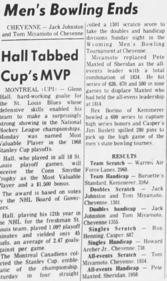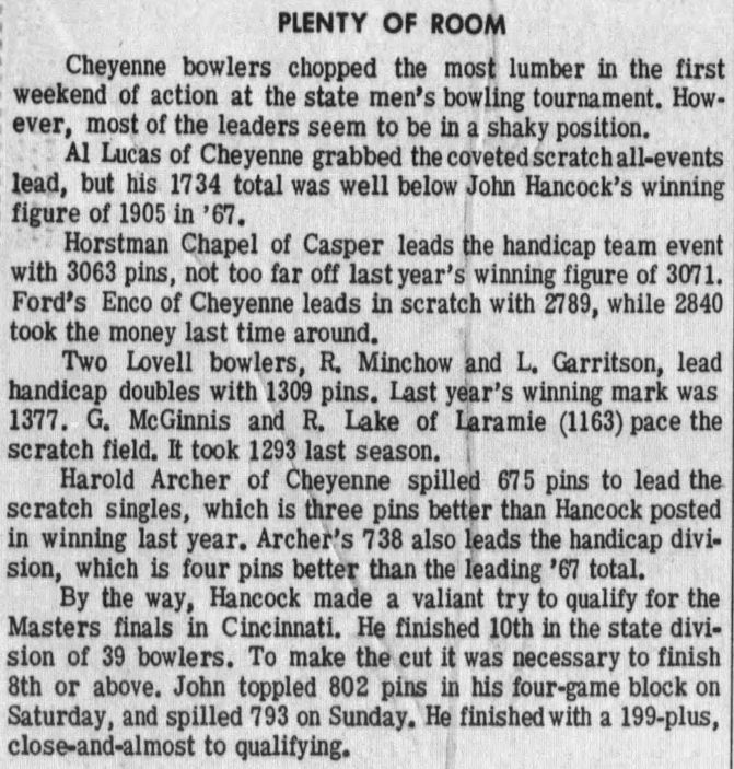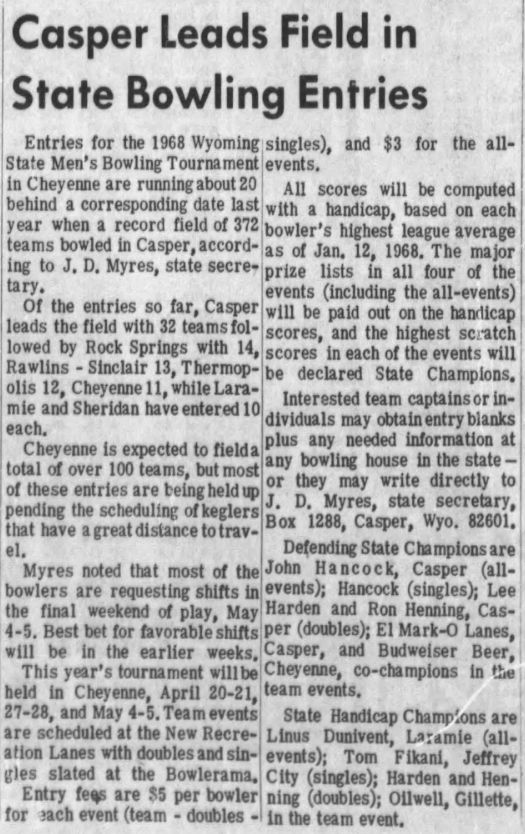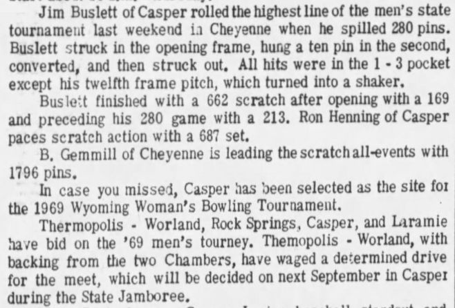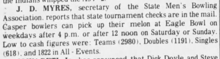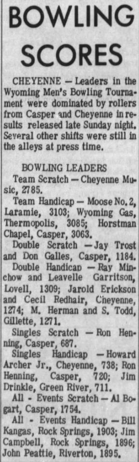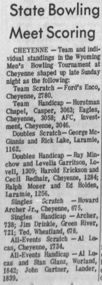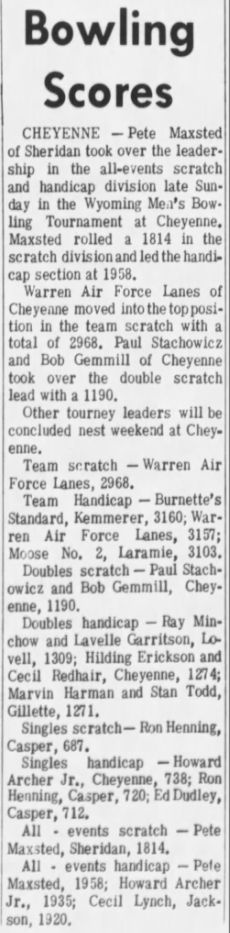 Jack Dansel and Orval Smiley were the owners/managers of Recreation Bowling Lanes per a 1964 Mountain States phone advertisement. Orval Smiley was the manager of New Recreation Lanes per the 1966, 1967 & 1968 Polk Cheyenne City Business Directory. In 1968, the 20th Annual Wyoming Men's State Bowling Tournament held the Team Event here in conjunction with the Doubles & Singles Event at Bowlerama. Orval Smiley and A Manford Bratberg were the owners/managers of New Recreation Lanes from 1969 through 1980 Polk Cheyenne City Business Directory. Jack L Mc Lees was the owner/manager of Centennial Lanes per the 1981 & 1982 Polk Cheyenne City Business Directory. Orval Smiley was the manager of Centennial Lanes per the 1983 & 1984 Polk Cheyenne City Business Directory. It isn't clear why the center was renamed to Six Shooter Lanes per a 1984 Mountain Bell phone book before becoming Cottonwood Lanes. Ace Jenkins was the manager of Cottonwood Lanes per the 1986 Polk Cheyenne City Business Directory. Casey Mc Lees was the manager of Cottonwood Lanes per the 1987, 1988 & 1989 Polk Cheyenne City Business Directory. Michael V Vasquez was the manager of Cottonwood Lanes per the 1990 through 2007 Polk Cheyenne City Business Directory. In 1994, the 49th Annual Wyoming Women's State Bowling Tournament held the Team Event here in conjunction with the Doubles & Singles Event at Two Bar Bowl. In 1999, the 51st Annual Wyoming Men's State Bowling Tournament held the Team Event here in conjunction with the Doubles & Singles Event at Two Bar Bowl. Lockers and pinsetters ended up at Pine Bowl per Jim Zitek. The lanes were made into shuffleboard tables. I am still trying to determine why the address number changed from 142 S Greeley Hwy to 312 S Greeley Hwy between 1980 and 1981. |